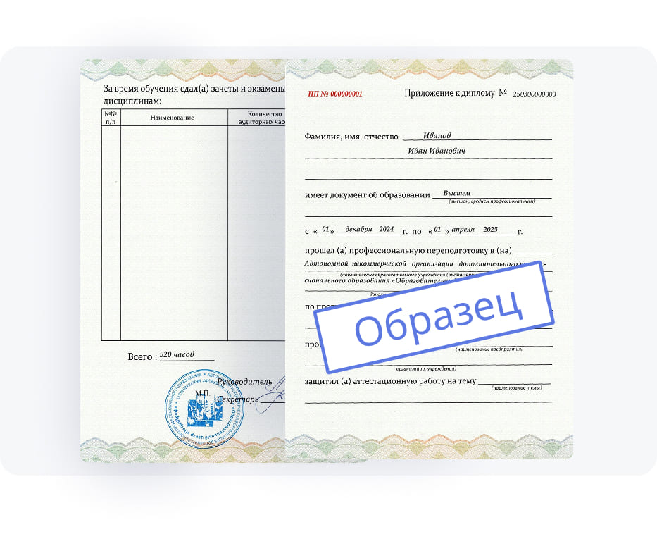 Важным условием для получения диплома о проф. переподготовке является наличие у слушателя профессионального или высшего образования. Такой документ открывает перед представителем профессии новые карьерные перспективы и возможности роста. Он важен при трудоустройстве в интересующую организацию, предприятия, компанию или фирму. Все данные вносятся в Единый реестр ФИС ФРДО.
